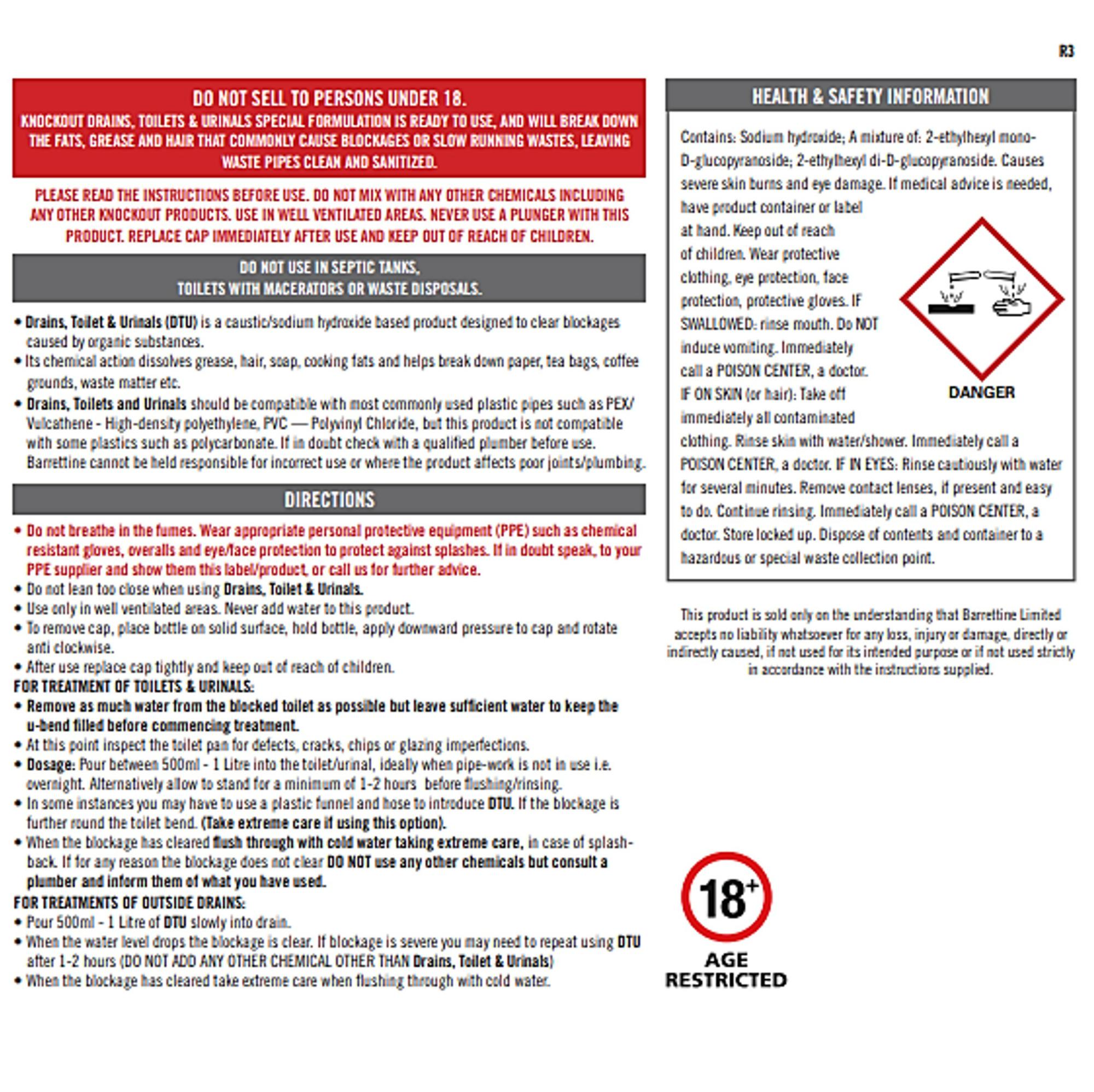 Home » Shop Online » HouseHold Cleaning » Cleaning Fluids and Solutions » Barrettine 500ml Knockout Drains, Toilets and Urinals 0432045