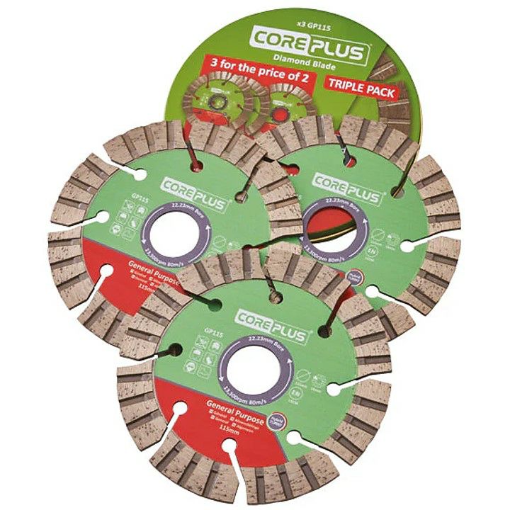 Home » Shop Online » DIY, Tools » Power Tool Accessories » Cutting, Grinding, Sanding Discs/Stones/Paper » Core Plus 3 x 115mm Hybrid Turbo Diamond Blade Set XMS24TURBO