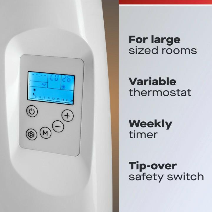 The intuitive LCD digital display on the front of the machine allows you to easily select mode of operation, adjust the thermostat to your required temperature, and set the 7-day programmable timer in a way convenient to your schedule.