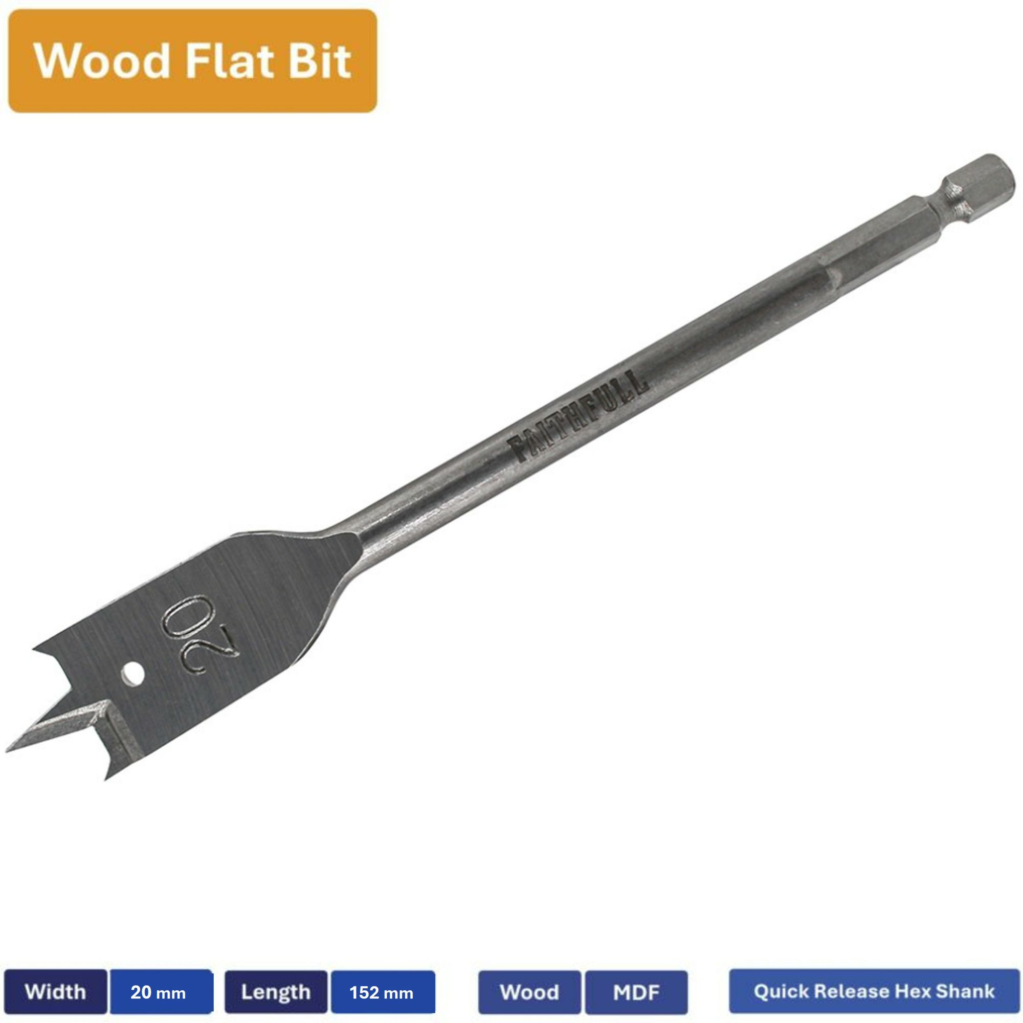 Home » Shop Online » DIY, Tools » Power Tool Accessories » Drill Bits, Keyless Chucks, Chuck Keys and Adaptors » Faithfull 20mm Flat Bit FAIFB20E