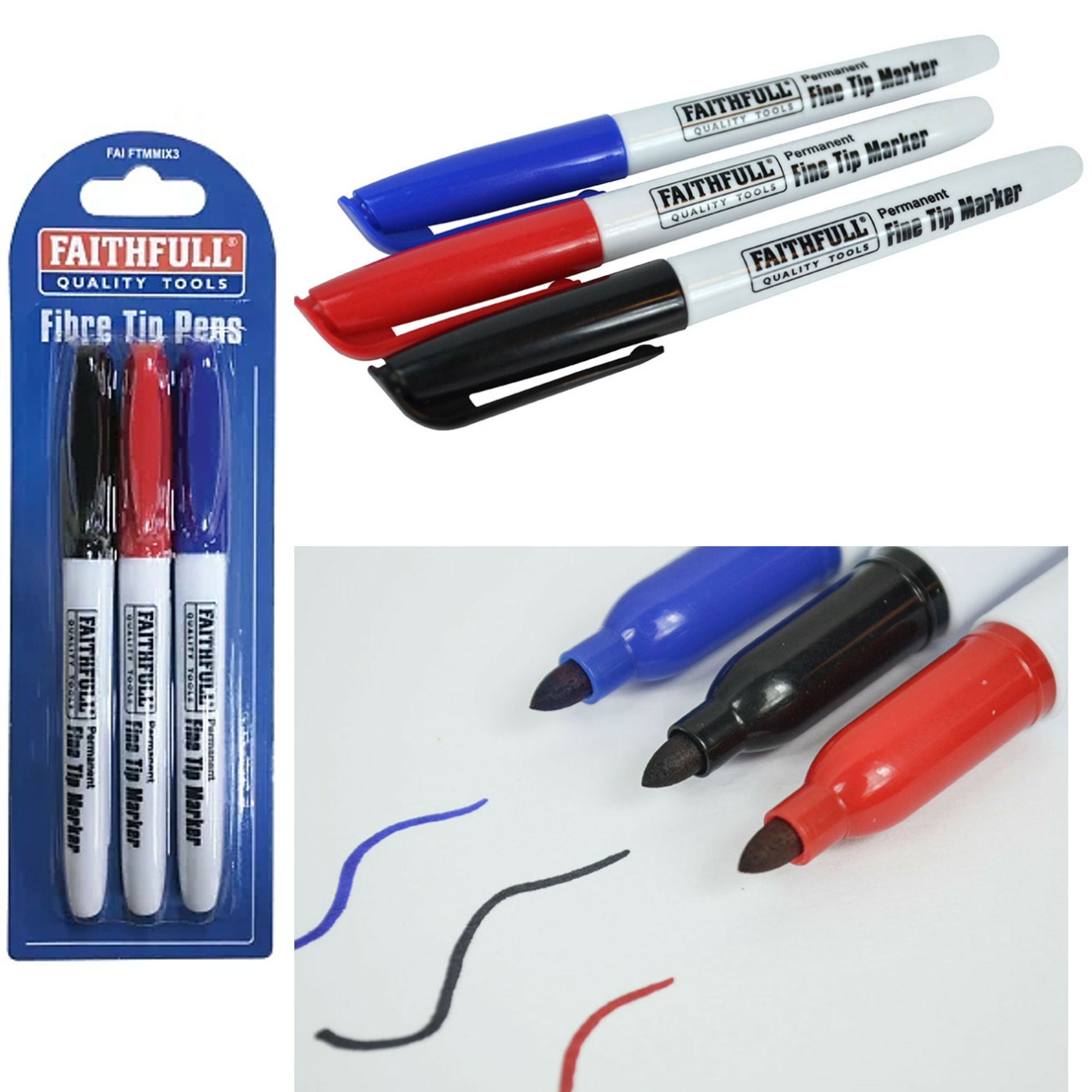Faithfull 3 Fibre Tip Marker Pens – Black, Red and Blue FAIFTMMIX