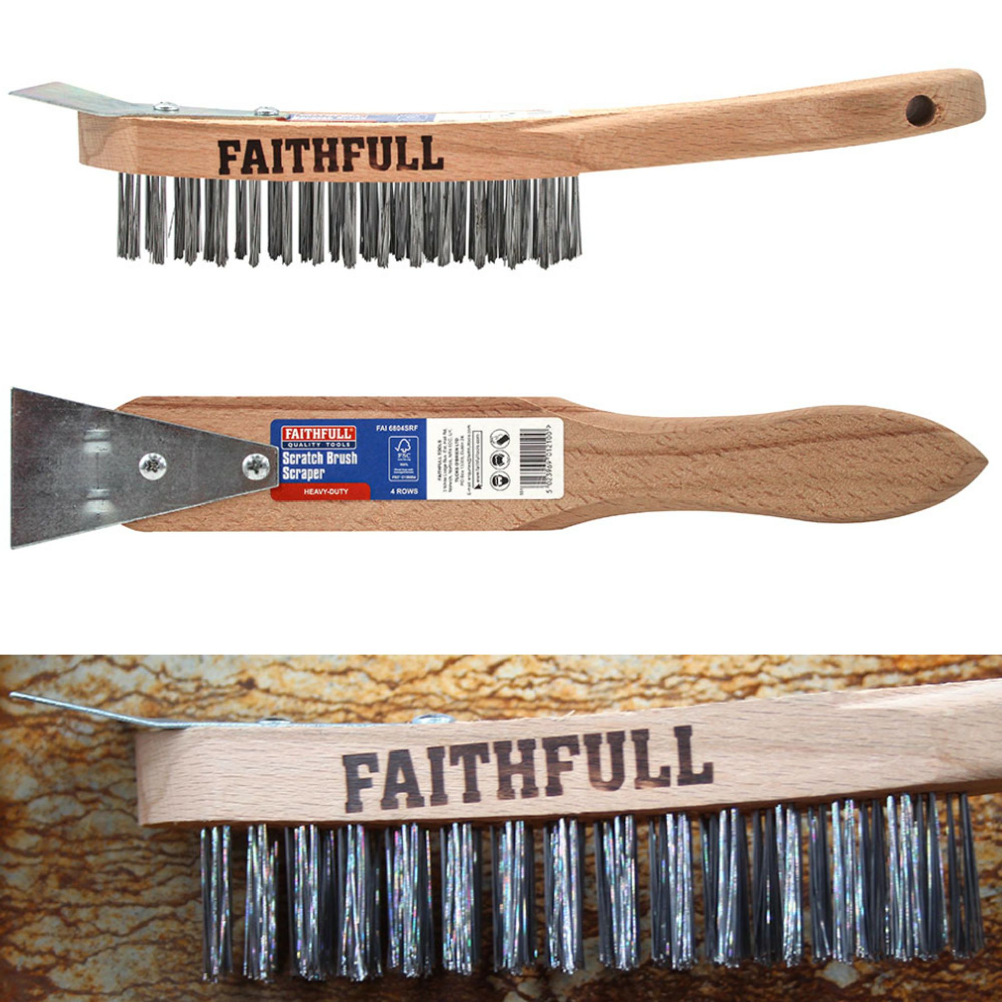 Home » Shop Online » DIY, Tools » Brushes » Faithfull Heavy-Duty 4 Row Scratch Brush with Scraper FAI6804SRF