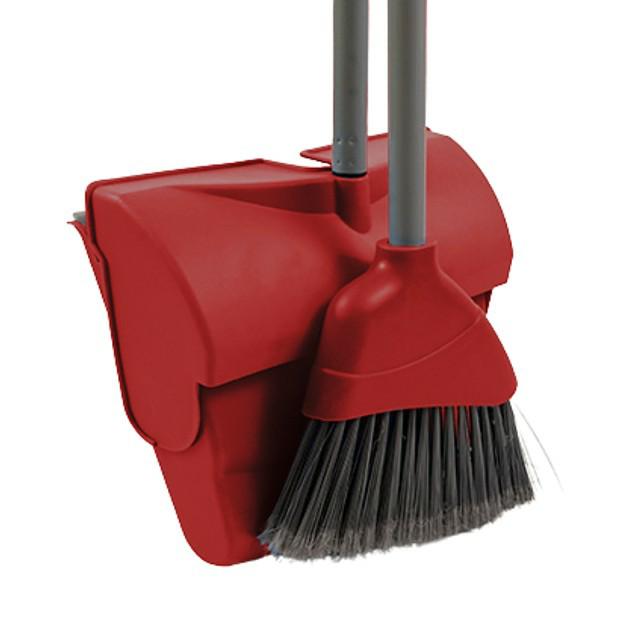 Self Closing Lobby Dust Pan and Broom Set 1607-RThe dustpan and handle is 1000mm long when hung up and the dustpan is closed. The brush and handle part is 900mm overall. The brush is 240mm wide. The maximum size of the mouth of the dustpan is 270mm wide x 64mm high, and the pan is 228mm deep.It has a soft lip ensuring close contact even with slightly uneven flooring. The brush is flagged to catch more dust, the Polyethylene fibres have plenty of flick for sweeping up bigger items of rubbish. The handles of the dustpan and the brush clip together, and the entire unit may be hung up after use, we recommend using the 4554. The handles are made with grey painted steel, with swivel hanging holes. This set is very good for all light industrial, janitorial, restaurant and household use, weighing in at just 850g.