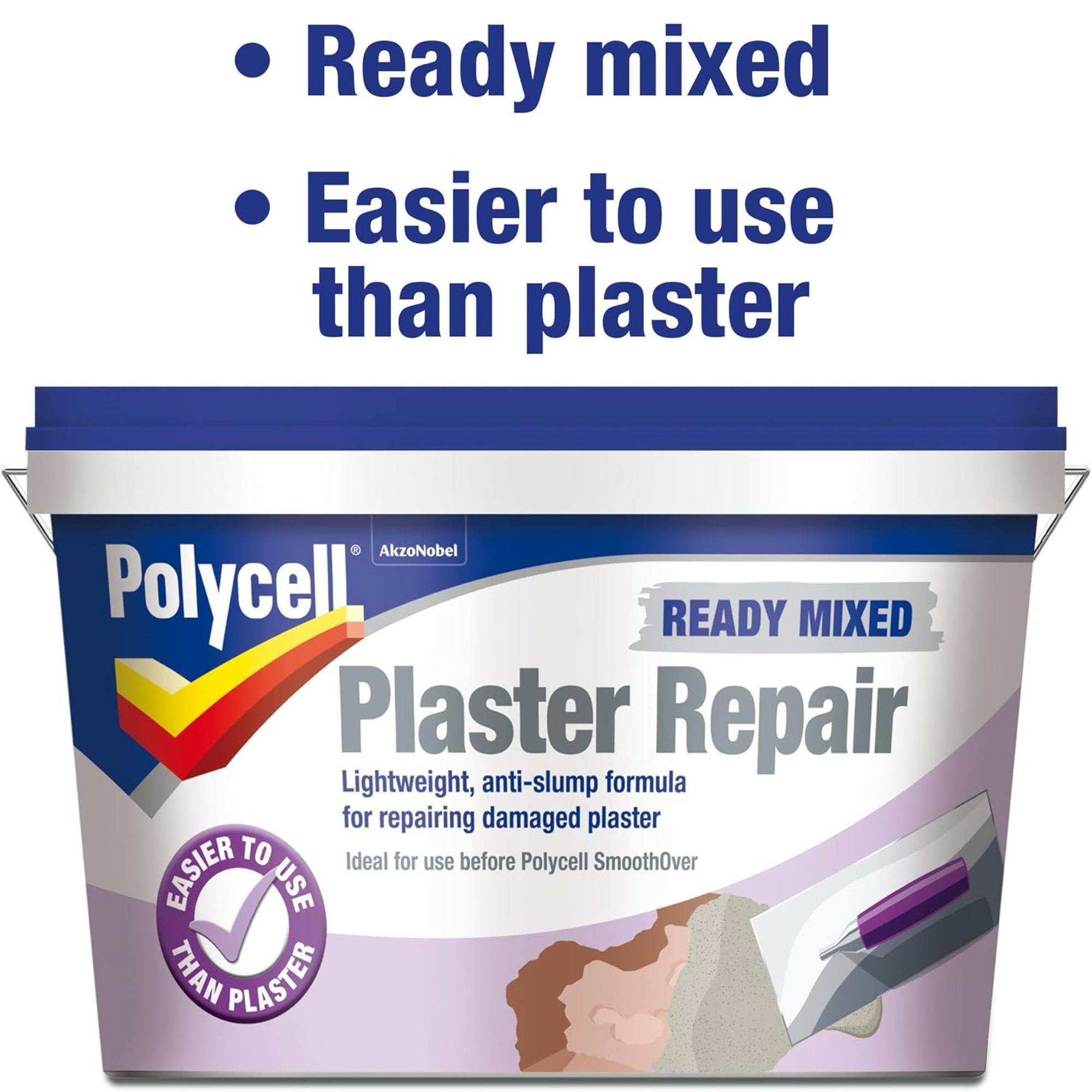 Polycell Ready Mixed Plaster Repair Polyfilla is specially formulated to be much easier to apply than ordinary plaster. It is for indoor use on plaster and will smooth out easily to a ready-to-decorate finish. Being ready mixed to a light consistency it will not slump, shrink or crack but adheres strongly. Drying time= 24 hours